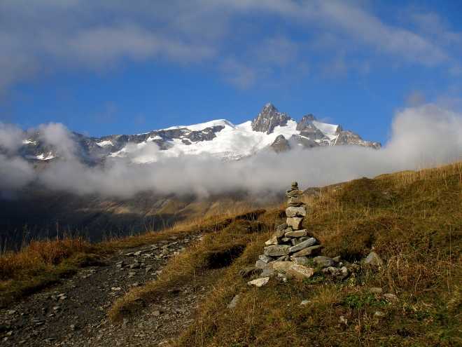 Un cairn le long du sentier avec, au fond, l'Aiguille des Glaciers.