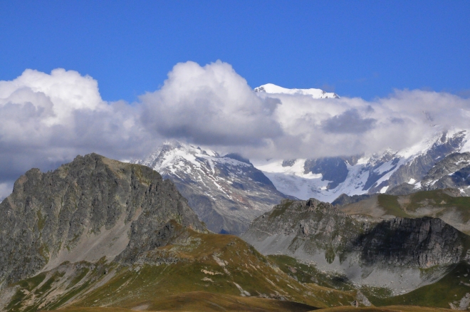 Du sommet, la vue côté Beaufortain. Au fond La Vanoise, la pointe de la Terrasse, l'aiguille du Grand Fond, le Roignais, la Pierra Menta.