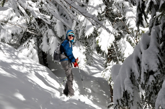 Bonnet obligatoire pour se protéger de la neige qui tombe des arbres.